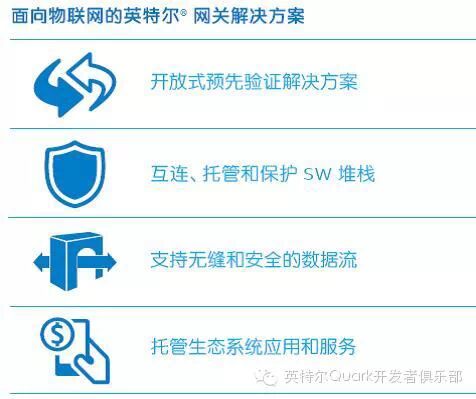 完整的该解决方案包括,面向多种开发套件的英特尔 处理器(英特尔Quark SoC X1000、英特尔Quark SoC X1020D 和英特尔凌动处理器 E3826);Wind River* 智能设备平台 XT 开发环境;迈克菲嵌入式控制* 安全技术。该解决方案构建于开放的基础设施之上,确保系统间的互操作性,支持广泛的应用开发以及轻松的服务部署。集成和验证的组件实现最大限度的灵活性和快速的应用开发和部署。