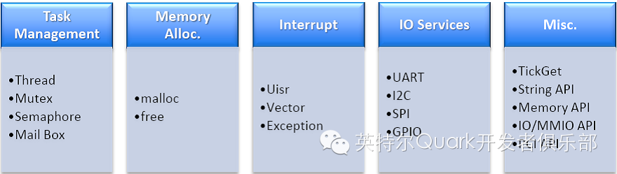纳微1.0 SDK内置了支持“SoC Only”功能的基本驱动集合,通过纳微核心功能可以确保所有原始驱动的实时性,非常好的支持英特尔® Quark™SoC上的所有元器件,允许使用者灵活地配置开发板上Payload,并提供公开的用户Apps接入界面。在纳微核心功能确保实时性基础上,用户可以借助核心界面扩展纳微的基本驱动,纳微1.0的驱动无需特定的驱动模式限制,可以让用户借鉴以往的开发经验。
