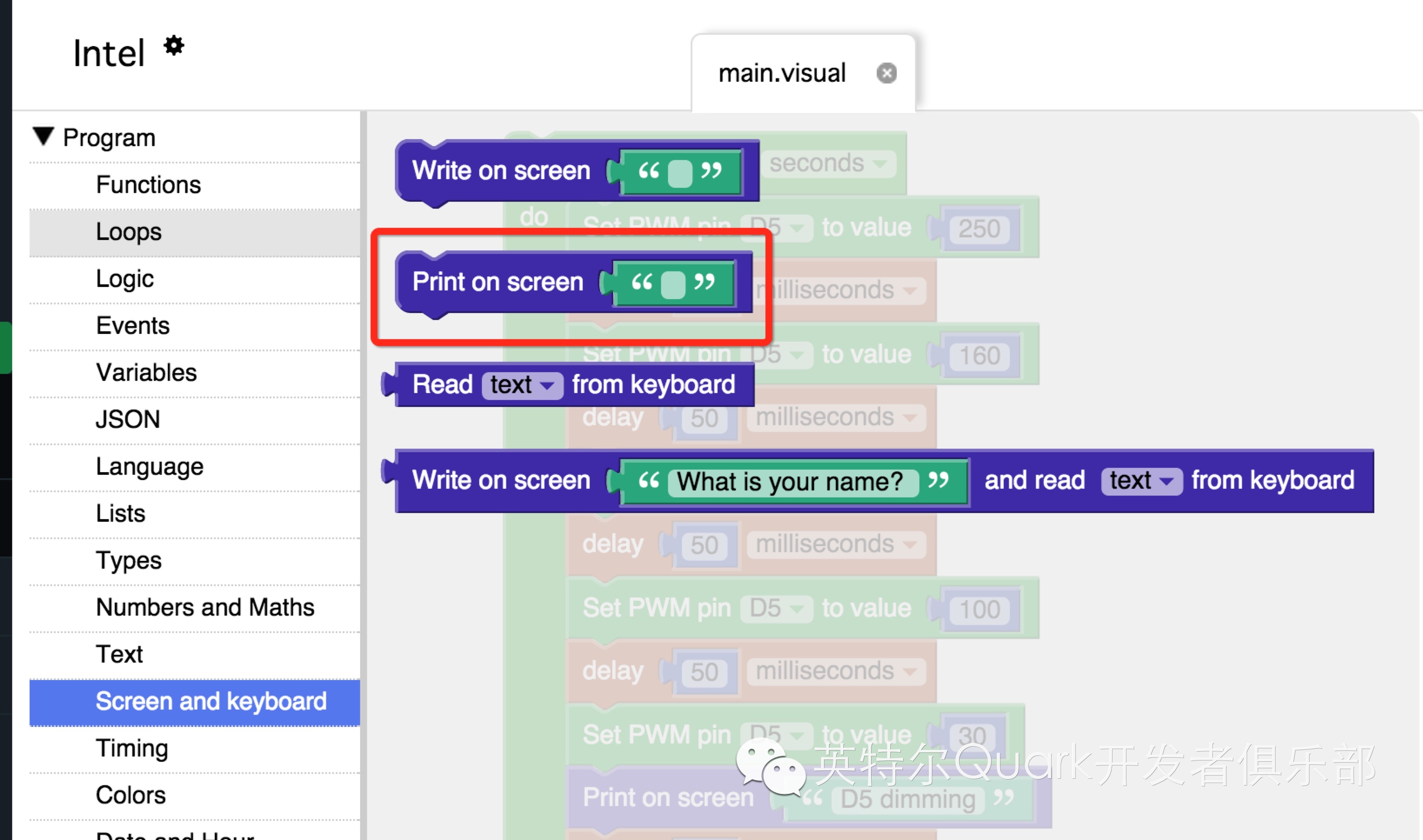 考虑到程序是运行在Intel Galileo上,其并没有外接屏幕,但是我们需要检测其运行状态,并对其进行Debug,所以需要将运行状态输出到当前屏幕,这里选择的时 Program>Screen and keyboard>Print on screen