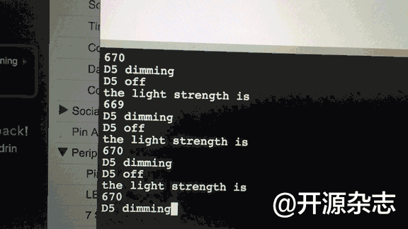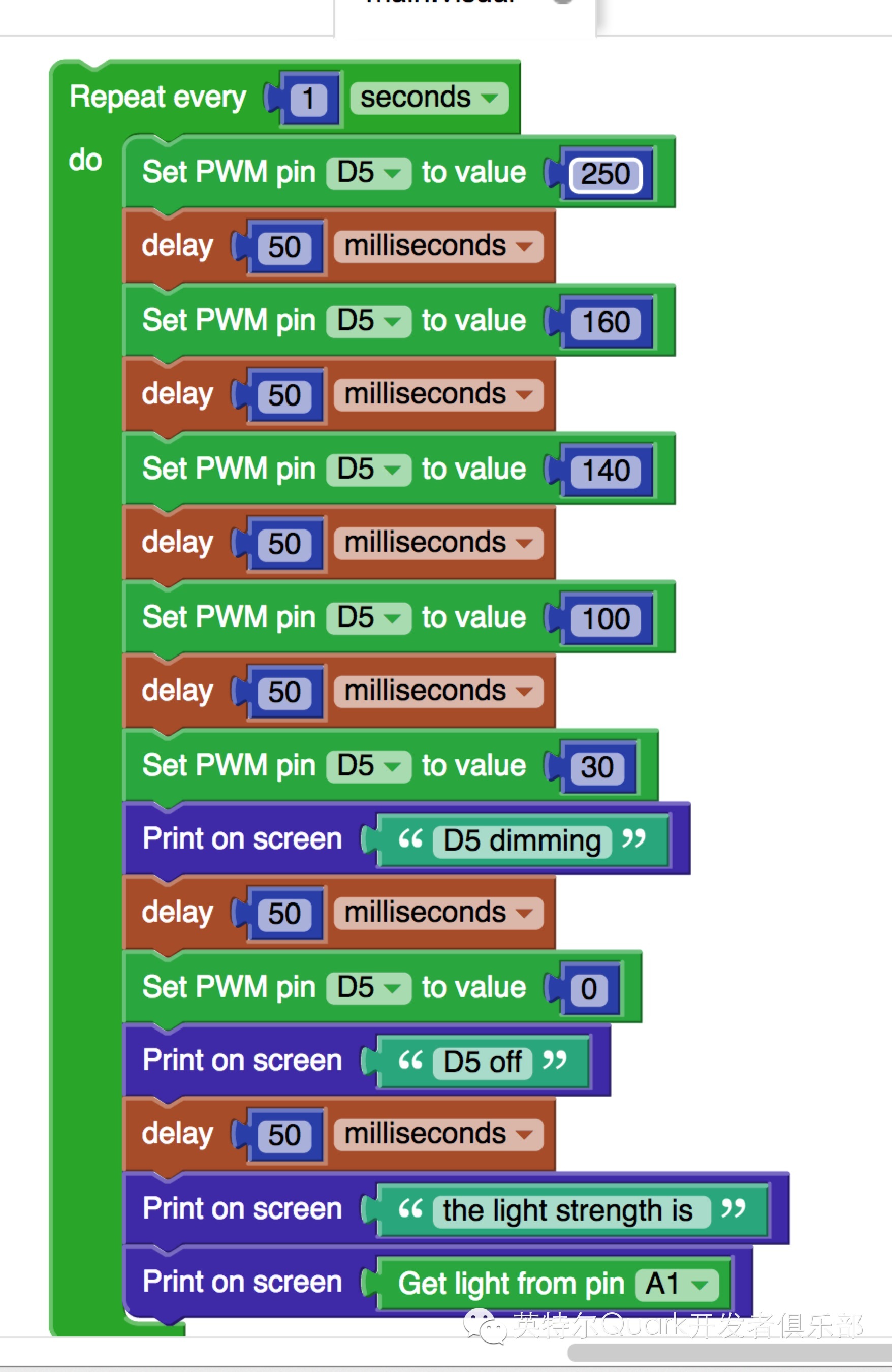 好了,剩下的就是拖拽了,把上面提到的几个设置项拖拽到中间的运行区域,按照上图进行排列设置参数,将会看到D5引脚的LED会渐灭然后关闭,关闭后会看到来自A1的光照传感器的读数。