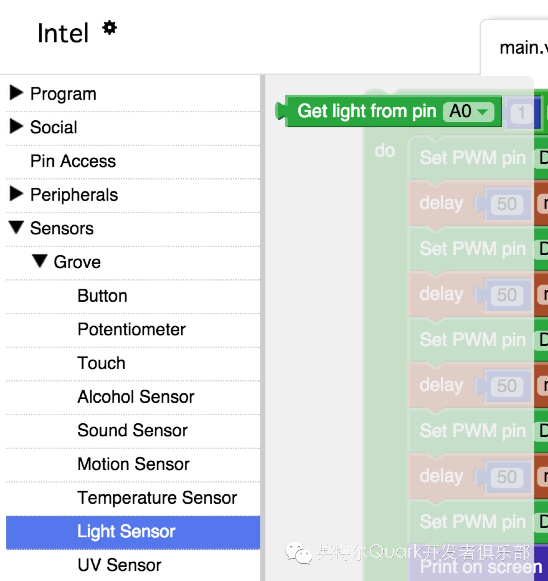 然后设定光敏电阻接的analog pin。如图所示,在Sensors>Grove下选定Light Sensor选项。其他传感器由于Wyliodrin封装比较棒,在使用上类似,大家可以多多尝试,之后的文章再做详细说明。