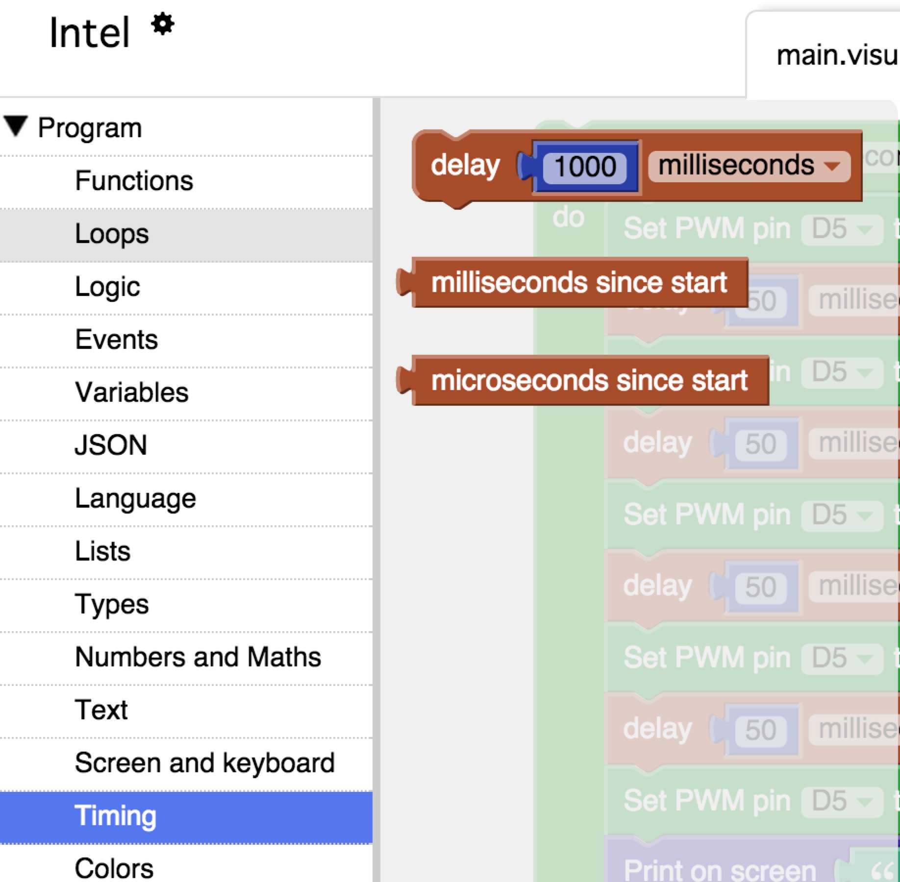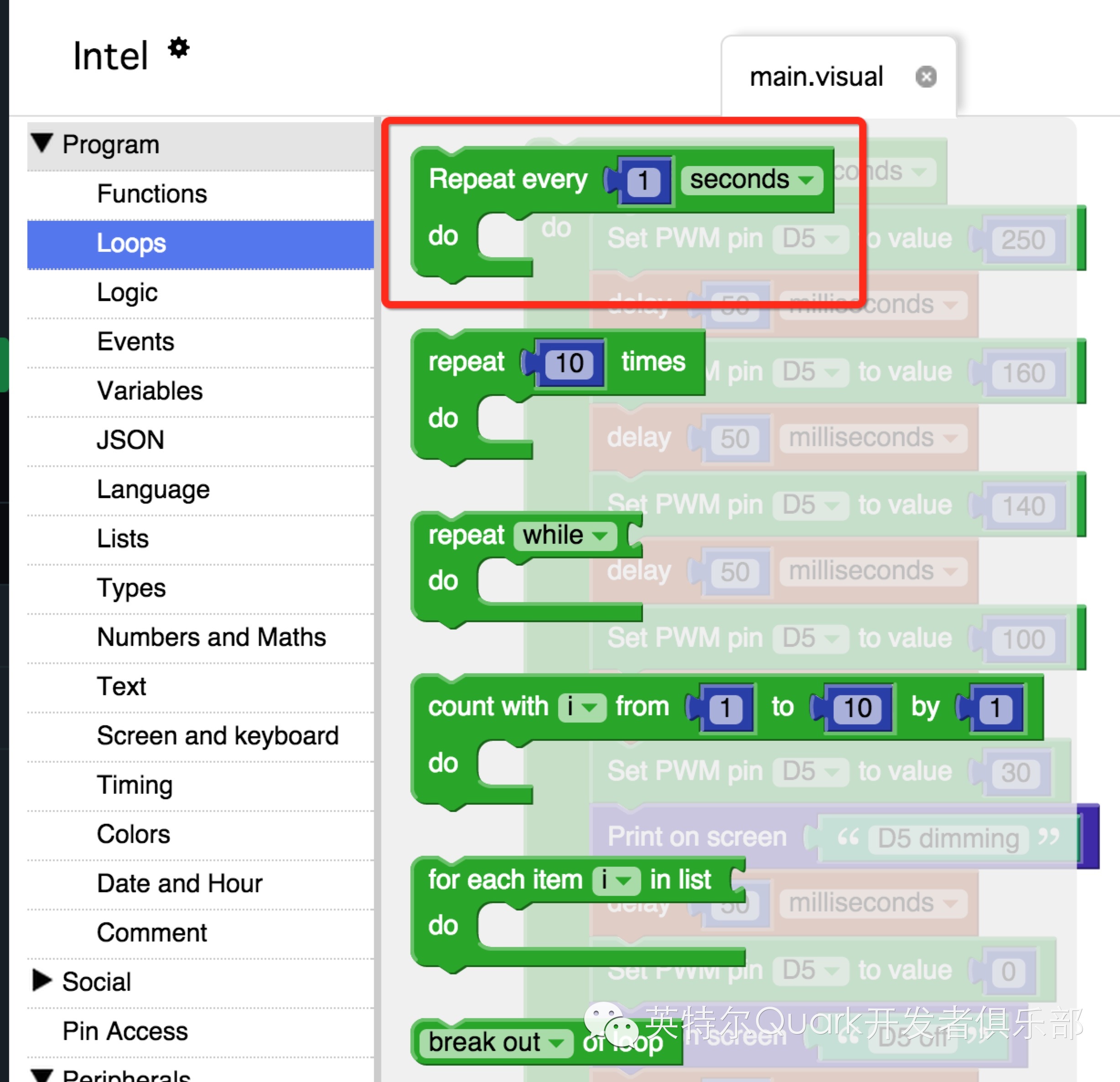 最后,最最关键的时,别忘了在这个程序运行过程中加一个延时,以便肉眼能观察到PWM在LED上表现出的效果。这里选的是:Program>Timing>delay "1000" milliseconds 。