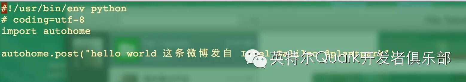 在“Intel-Galileo-client”文件夹中通过“vi Intel-Galileo.py”新建一个文件,将如下代码复制其中,其中“import auto home”为导入当前目录下的“autohome.py”,"autohome.post"为调用“autohome.py”内的post函数,(其他相关的函数可进“autohome.py”查看,之后的文章再做详解),通过“autohome.post("hello world 这条微博发自Intel Galileo @plantpark")”发送微博。