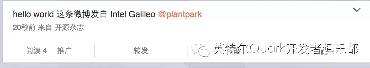 至此,在Intel Galileo上发微博的功能实现了,之后的文章向大家讲解如何读取相关关键词或特征的微博触发然后执行点亮LED的动作。