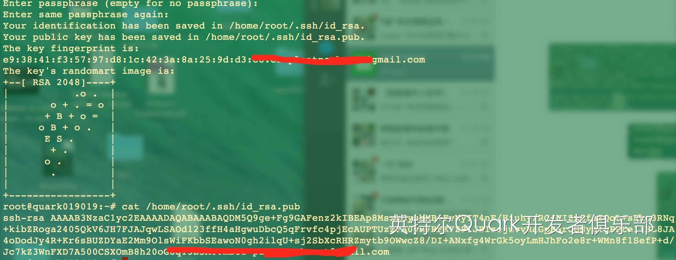 在命令行中敲入如上代码,出现上图所示界面,找到“Your public key has been saved in”,这时候需要通过“cat/home/root/.ssh/id_rsa.pub”读取public key,出现下图所示字符串,将其全部复制。