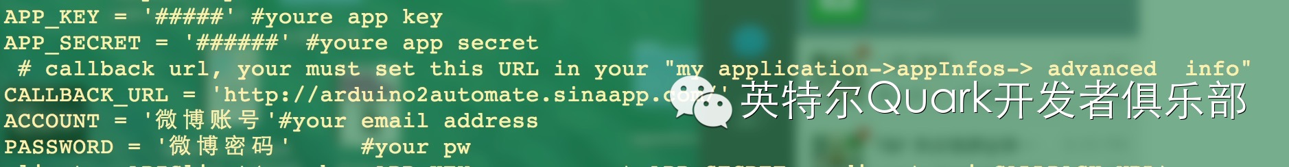 进入“Intel-Galileo-client”文件夹,“vi autohome.py”编辑autohome.py文件,配置微博APP_KEY和APP_SECRET,与微博账号和密码,这里我将申请的APP_KEY和APP_SECRET公开供大家测试使用,账号和密码处自行填入自己的微博账号和密码。