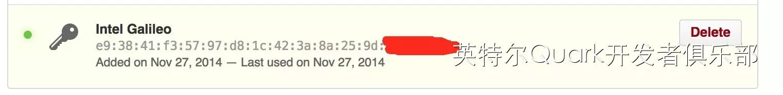 现在再执行下文章开头的命令“git@github.com:plantpark/Intel-Galileo-weibo-client.git”,出现上图所示的“Check connectivity ...done.”至此,github账户配置成功,回头刚才在github配置的页面,出现下图所示“Added on Nov 27.2014 -Last used on Nov 27.2014”即说明当前设备(Intel Galileo)已经获取了Github账户的权限了。