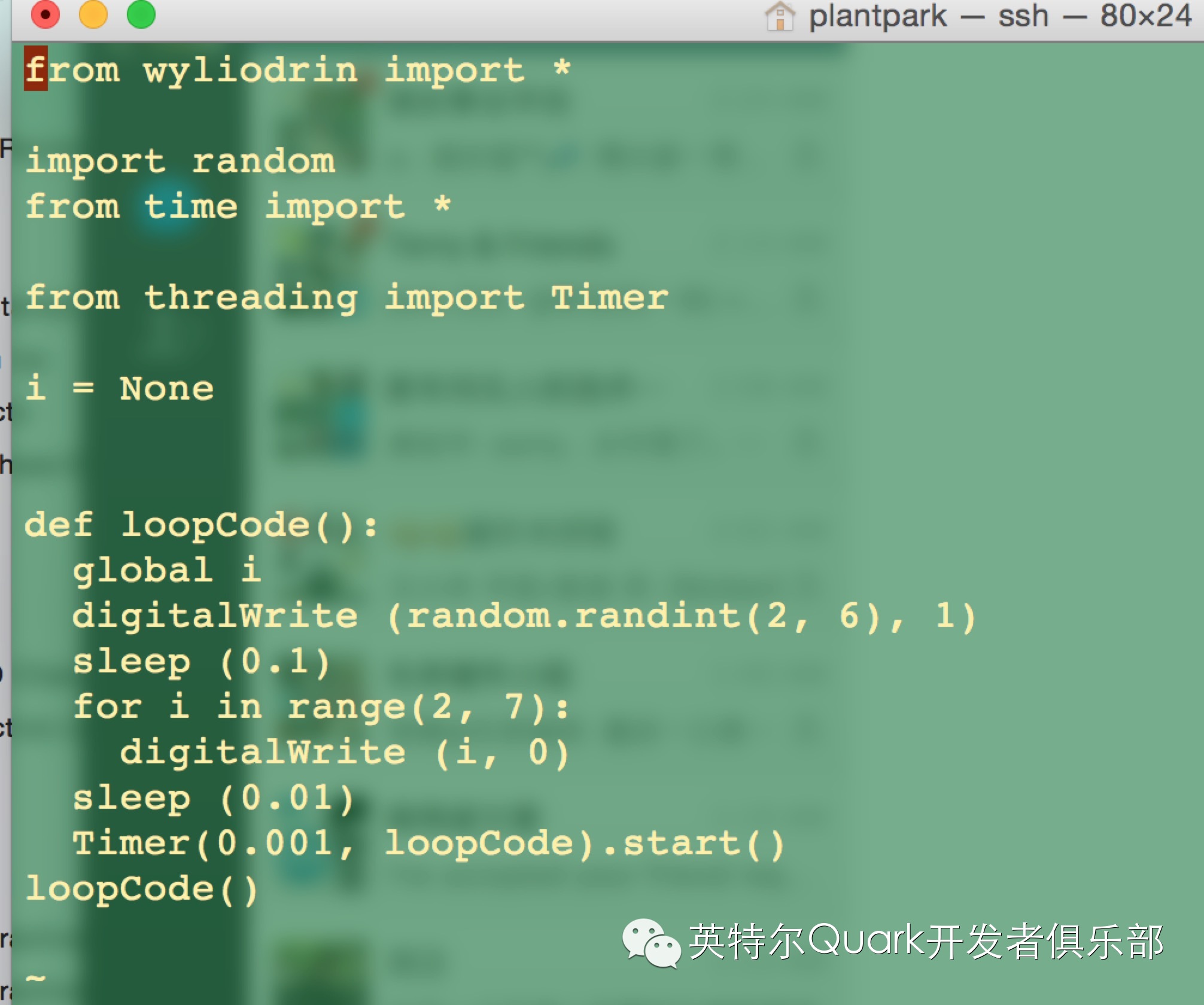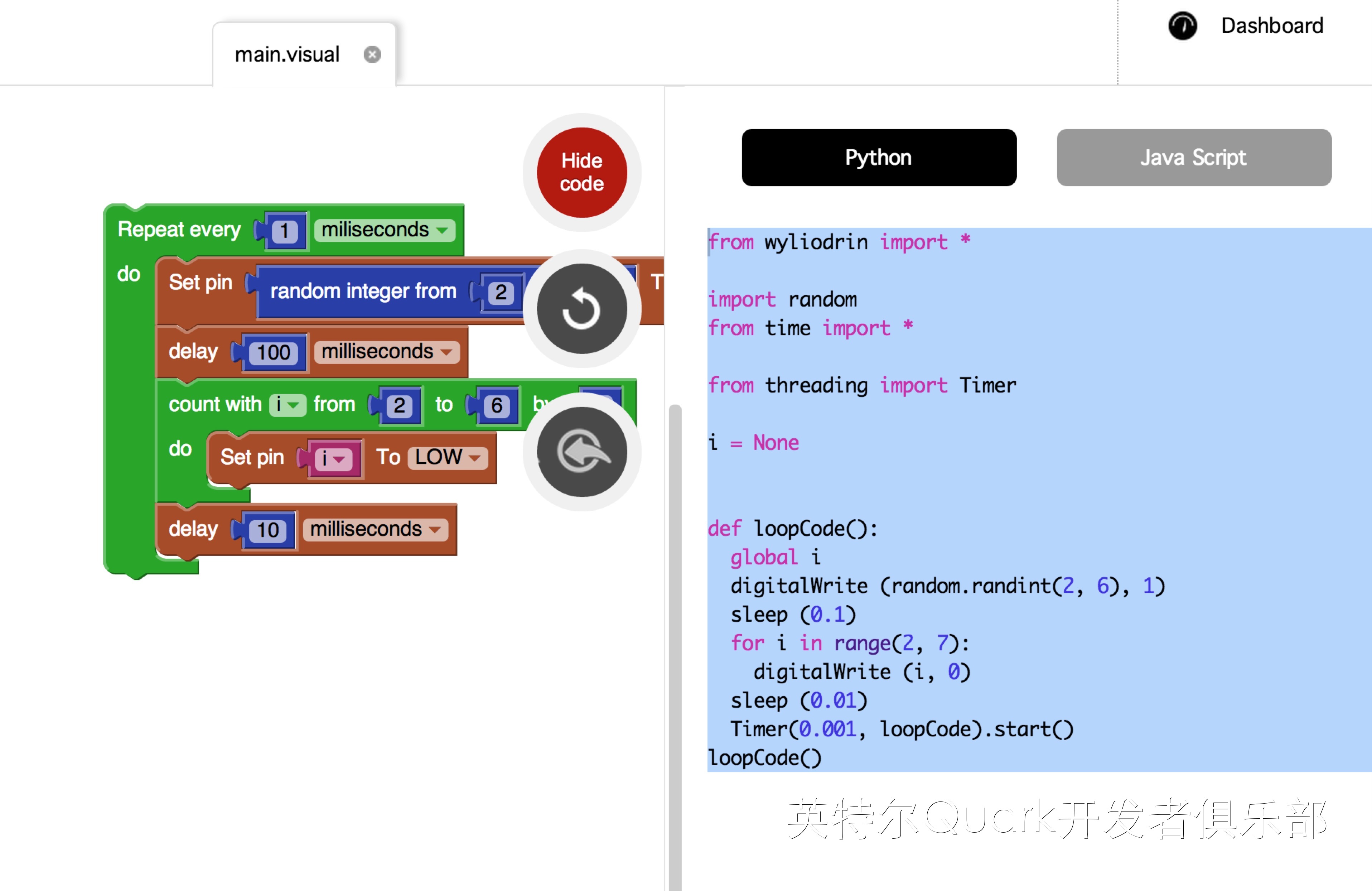 此外,点击右侧的“show code”,可查看当前程序的python或javascript代码,将这段代码如下图直接复制到Intel Galileo中,可在系统中直接运行,效果与通过Wyliodrin在线平台运行效果一样,并且,可对这段代码进行修改和个性化定制。这种便利在其他图形化编程软件中尚属少见,不仅方便初学者对图形化界面的需求,又能满足有编程经验的朋友直接对生成的代码进行修改操作。