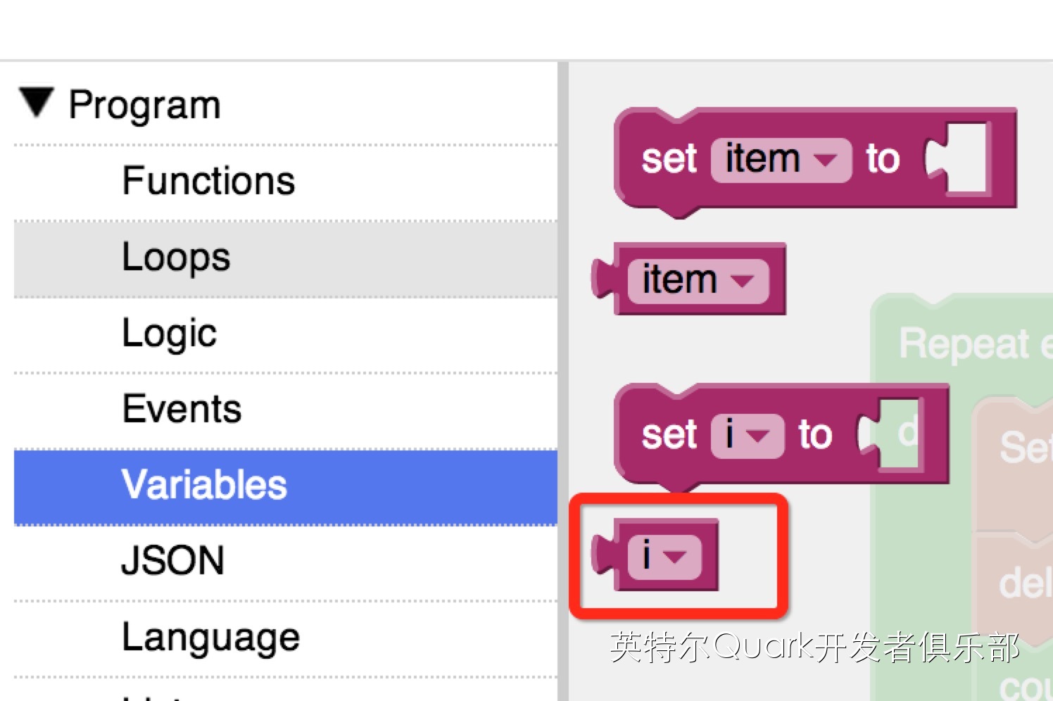 将变量(Variables)“i”取出,放在关闭LED的命令中