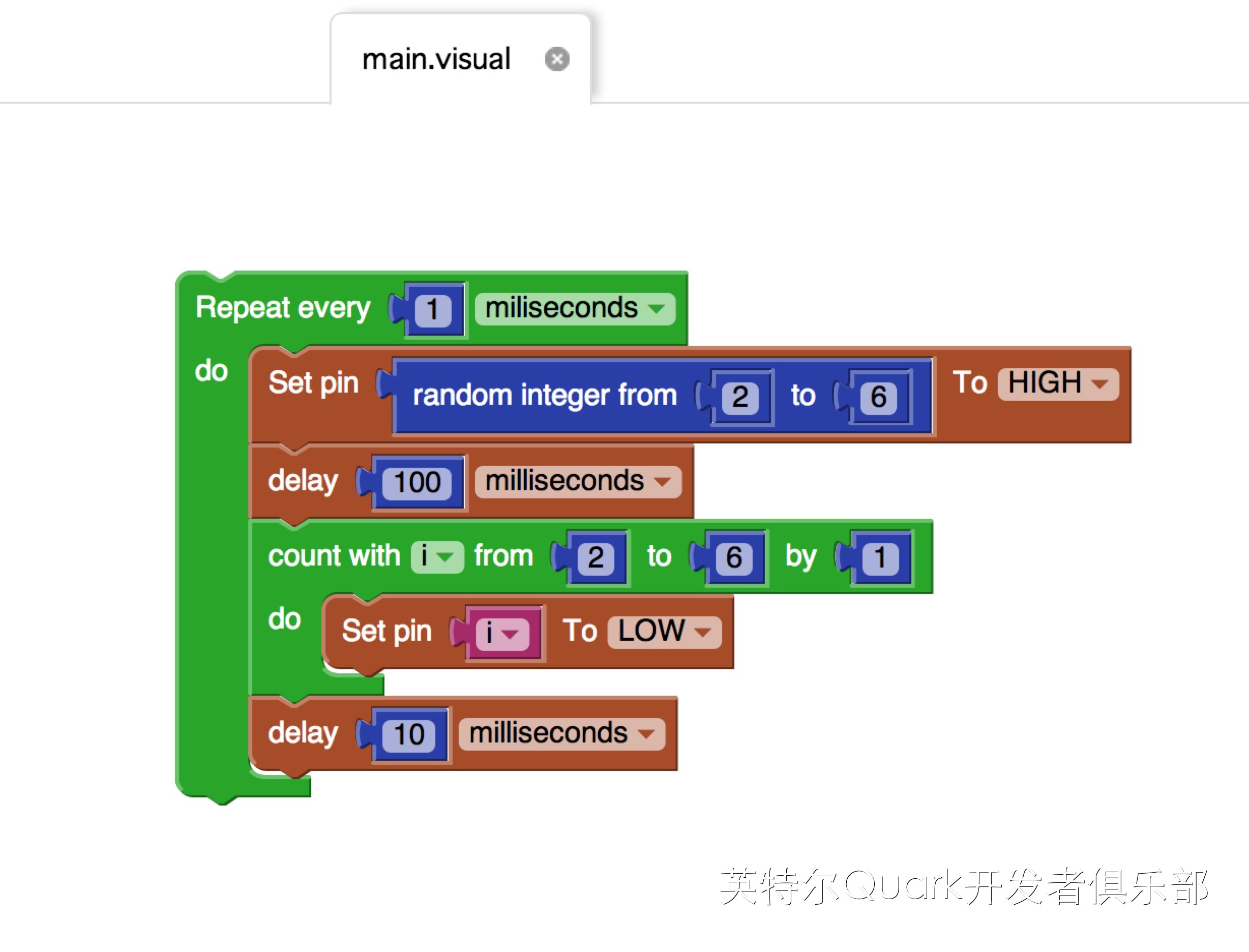 然后就是生成随机数,Program->Numbers and Maths->random integer from 1 to 100,因为只是用了2-6号引脚,所以随机数的范围为2-6.