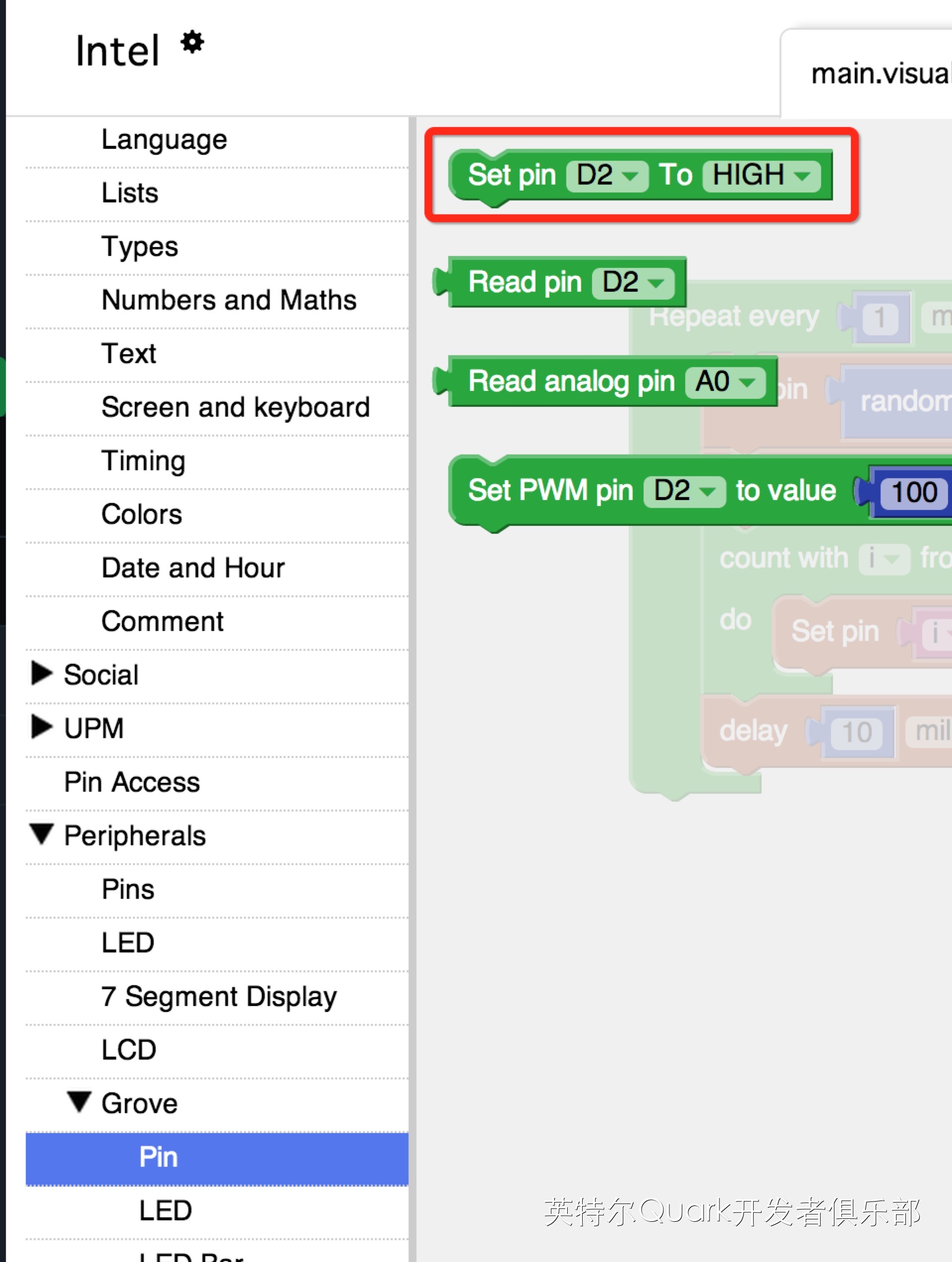 其次是Perpherals->Grove->Pin->set pin D2 To HIGH,将D2引脚点亮。