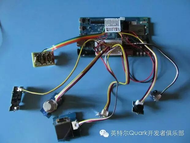 继续基础单元的制作,将传感器和英特尔Edison板连接起来,在此步骤中,你将使用到所有的传感器(除了OLED屏,我们会在接下来的步骤中连接),半尺寸的博原板和一些导线。