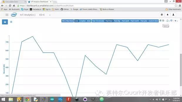 你的显示屏应该开始初始化,紧接着会显示主菜单,然后一小会儿之后传感器开始工作,将数据传送到英特尔IOT分析中。如果要查看数据,进入“Charts(图表)”选项卡,选择你想查看的设备和传感器。这些数据还被存储在MySQL中,名为EDE,因此你可以导出EXCEL表格来查看数据。