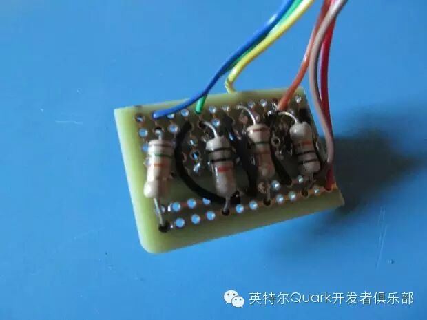 6.将4个10K的电阻的一端连接到上述使用的引脚上,另一端接到5V电源线上;