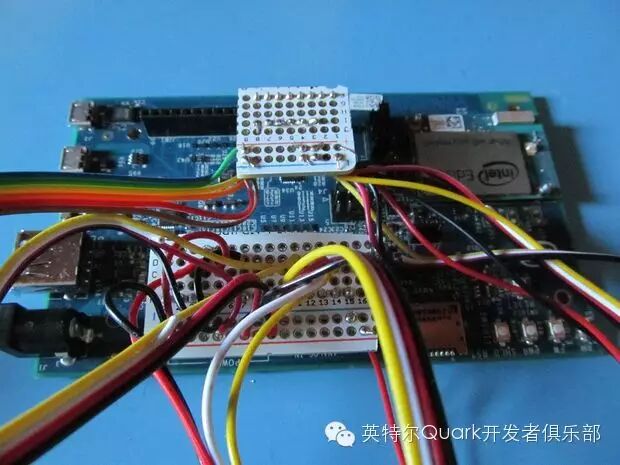 接下来,你需要把8个传感器所连接的红色的导线焊到博原板(+)正极的一面,同时将黑色的地线接到较大的那块博原板(-)负极的一面上,然后连接板的两面的正负极,在更大的面包板上焊接一根5V的跳线,连接到Edison 5V引脚上,另一头接地。