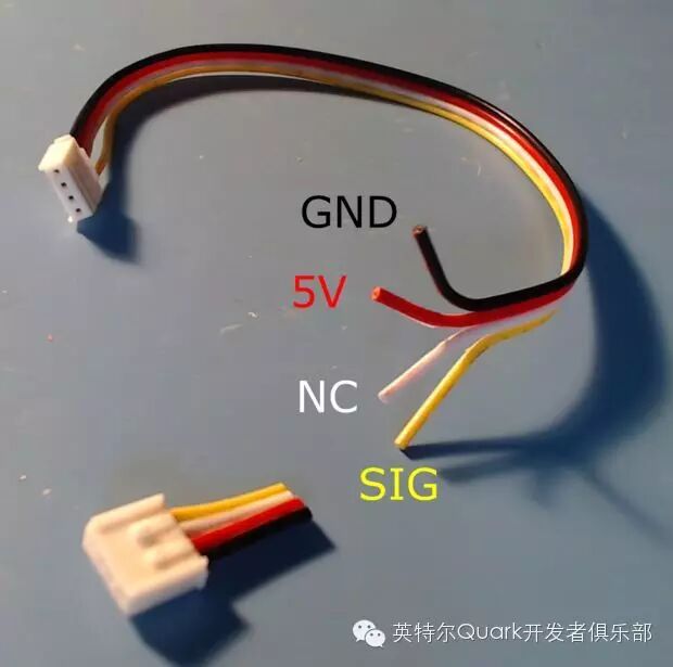 所有的格罗夫传感器都用同样的四根导线组,如图中所示,地线、电源线、信号输入线和NC。白线也是一条信号线,但它不被用在基础单元的传感器连接中。剪断电缆的一端,使其露出金属丝,然后焊接。