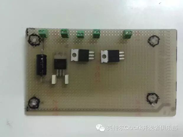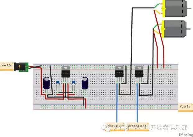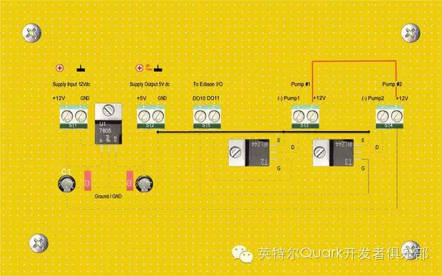 在这一步中,实现使用爱迪生来驱动灌溉泵是至关重要的,要使5V的Edison能够驱动12V的马达借助一个MOSFET晶体管或继电器是必要的。同时作为控制开关和灌溉按钮,因为MOSFET晶体管尺寸小、低功耗的优势,在此步骤中,我们使用两个MOSFET来代替继电器。提供5V电压的电路已被考虑添加到未来的开发程序中,或许是下一个版本就是有。