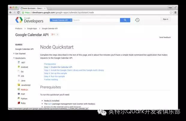 要了解如何设定 Google Calendar API,请参考 Google Developers 网站上的 Node.js Quickstart指南:https://developers.google.com/google-apps/calendar/quickstart/node