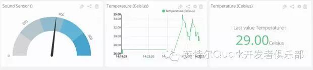 7) 在这里,声音传感器选择的是“Gauge”,温度传感器选择的是“Graph”,通过观察Gauge可以轻易地得出声音强度,以此来衡量你家小宝贝的活动,通过Graph你可以看出温度的起伏。