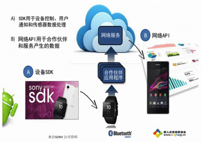 智能穿戴设备既是一个最终的产品,也可能是一个云平台的感知设备,在其上通过运行各种应用软件来完成不同的任务。还有一种说法,智能穿戴设备是物联网系统一个外延,其实说的是一件事情。图4所示是Sony smartwatch应用生态环境,Sony smartwatch提供基于设备的SDK用于传感器数据采集、设备控制和通知,基于云端的服务的API提供数据处理和存储,它们彼此的联系是通过智能手机完成。手机蓝牙与穿戴设备通讯,手机的3G/4G或者Wi-Fi与云端通讯。用户使用这样生态环境开发出各种各样的应用软件,让穿戴设备和智能手机一样大放异彩。