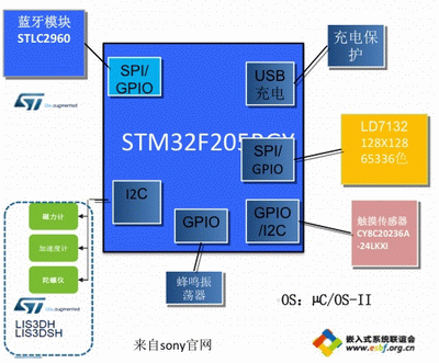智能穿戴设备的核心是一个典型的嵌入式系统,它由一颗或者多颗MCU(微控制器)或者MPU(嵌入式微处理器)加上运动和环境传感器、无线通讯芯片(蓝牙芯片)、显示和输入装置等组成,一个典型的智能穿戴设备-Sony 智能手表的组成如图3所示。